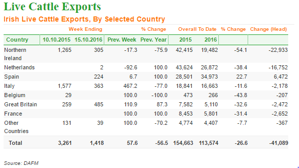 This year has seen a 26.6% reduction in overall live exports for the week ending October 15, a drop of 41,089 head of cattle on the same period in 2015.