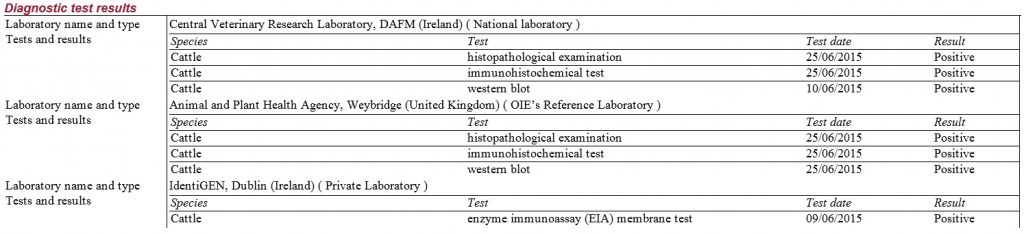 In addition, samples were also forwarded to the European Union Reference Laboratory in Weybridge, United Kingdom. Final confirmatory test results were received from both laboratories on June 25, 2015, confirming the case to be classical BSE.