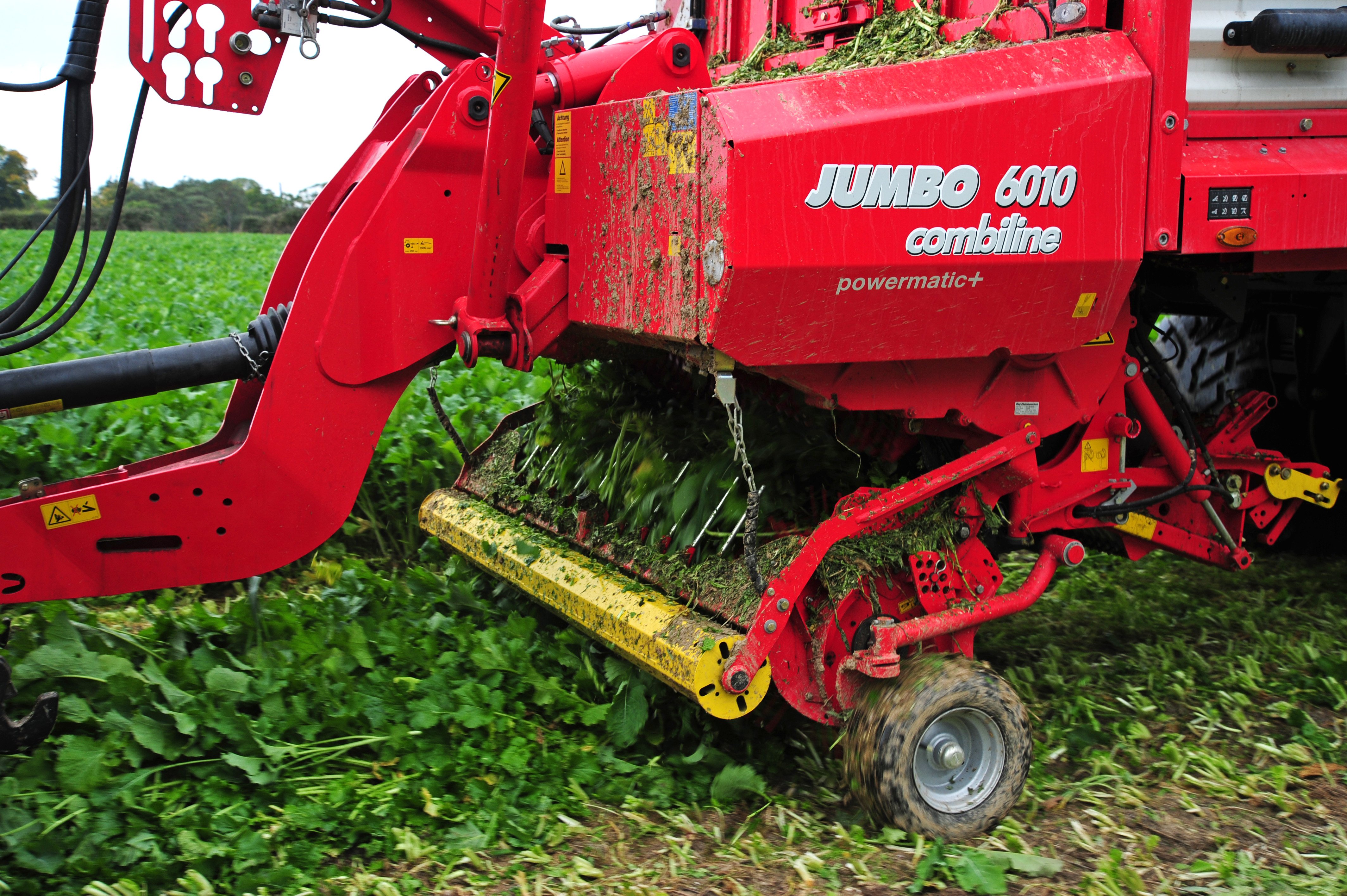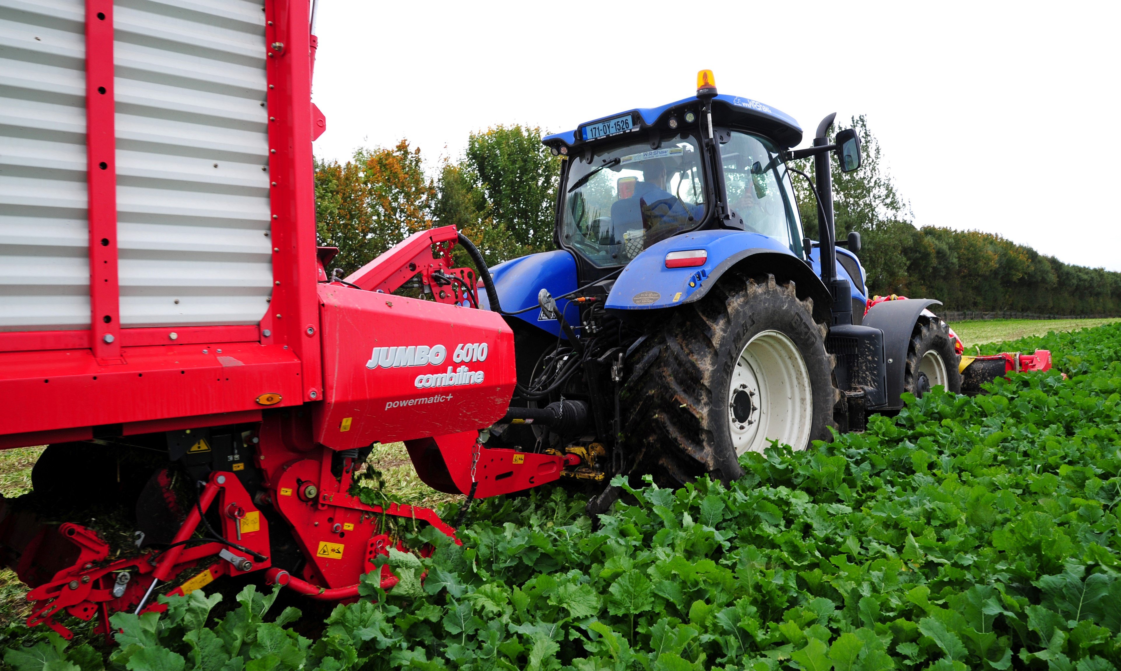 Having been cut, the crop needs to be collected and delivered back to the farm. For this task a Jumbo 6010 Combiline is hitched to the rear and filled to around half its capacity every second day.