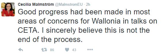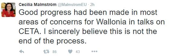 Airing her views of twitter, Malmström said the Commission has engaged wholeheartedly with Wallonia in recent days and she was truly saddened that talks had broken down.