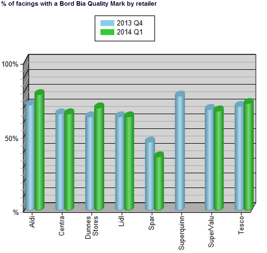 Products covered in the audit are bacon, beef, burgers, chicken, cooked ham, duck, lamb, pork, rashers, sausages and turkey. Each product was assessed based on the percentage of ‘facings’ (individual products on shelf) and SKUs (product lines)with the Bord Bia Quality Mark.