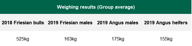 The 2019 Friesian calves had an average weight of 163kg, while the Angus males and heifers weighed 175kg and 155kg respectively.