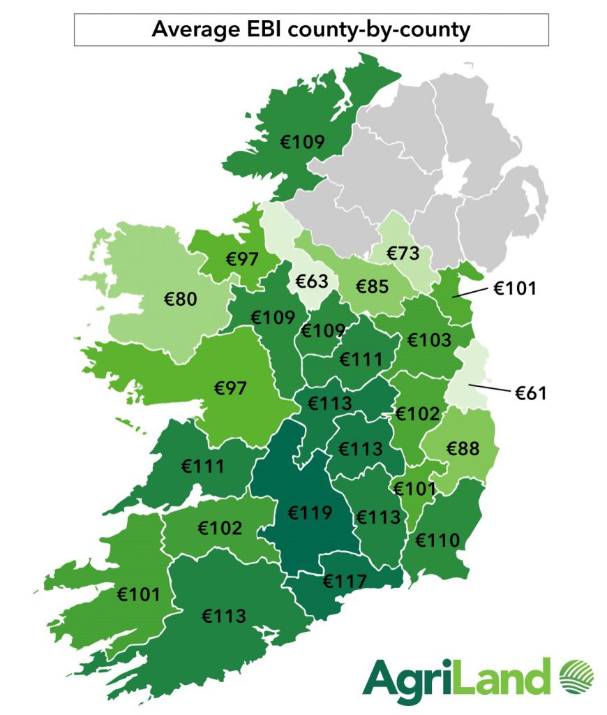 Looking at the EBI on a county-by-county basis, the county with the highest EBI is Co. Tipperary with an EBI figure of €119.
