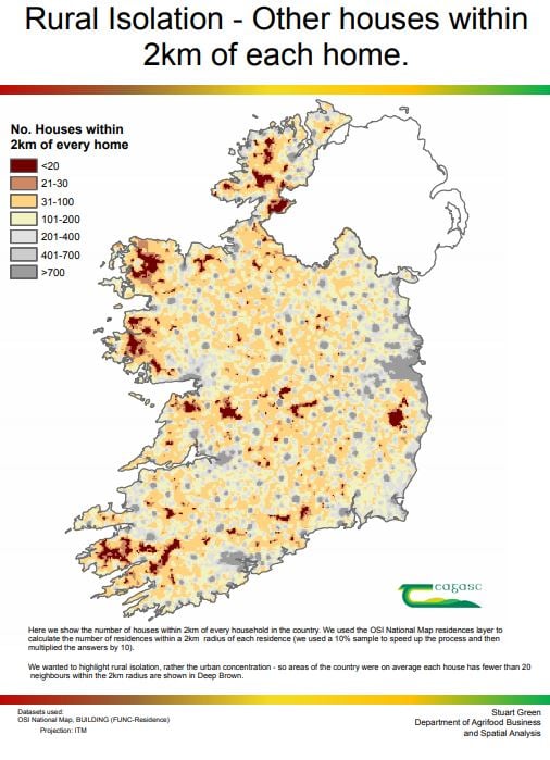 Explaining the map, Teagasc said: “A 2km radius circle is quite a big area – 1,200ha – and within cities there are thousands of residences in this area. But in parts of rural Ireland the number of dwellings can get very small and the map highlights those areas where each household has fewer than 20 neighbours.