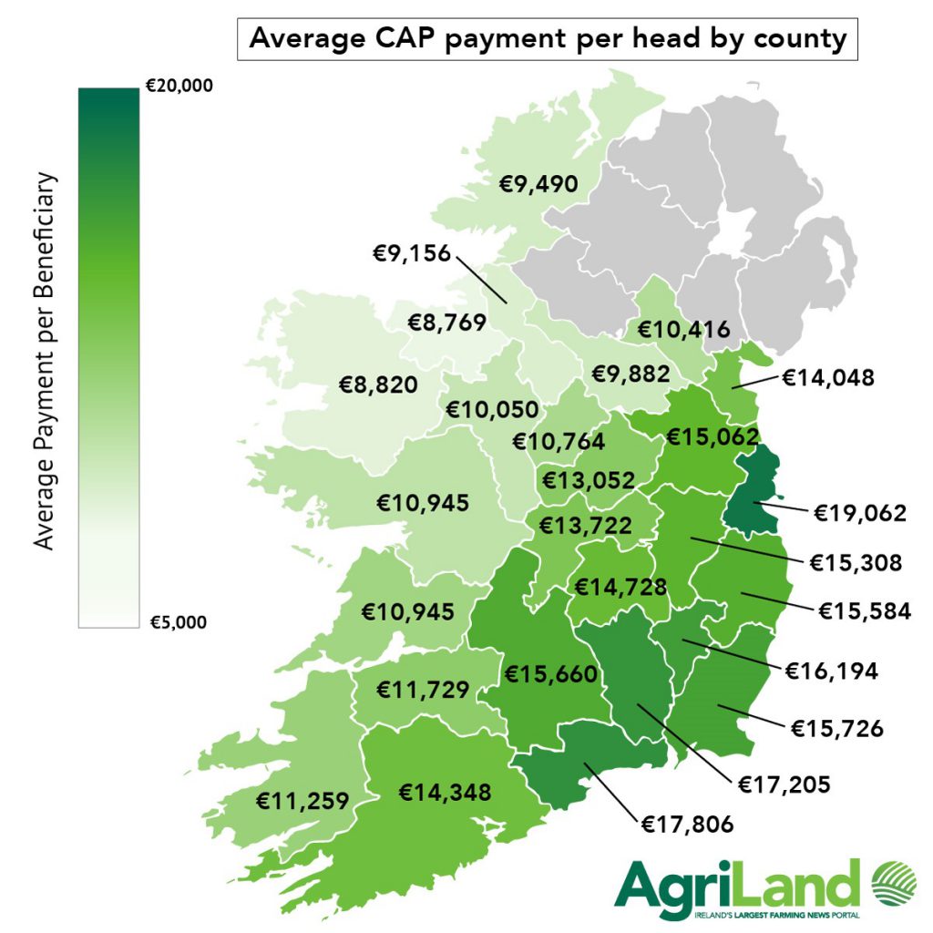 The average CAP payment dipped to below €10,000 for beneficiaries in the Connacht region and in the three counties of Ulster in 2016.