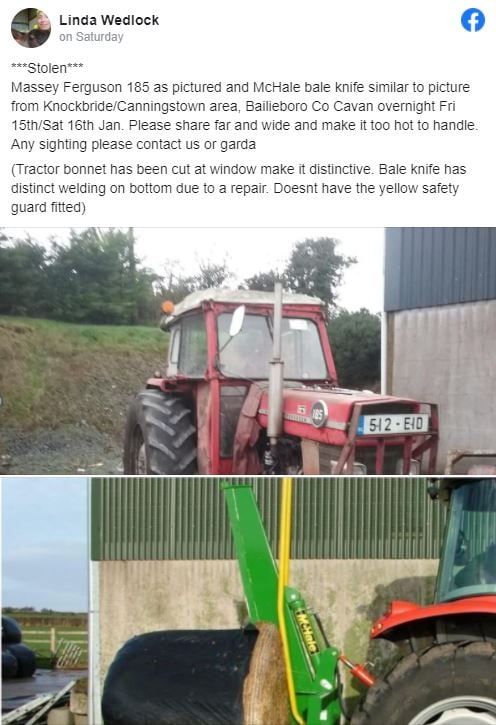 Facebook user Linda Wedlock noted that the theft occurred in the Knockbride/Canningstown area of Bailieboro on Friday night/Saturday morning.