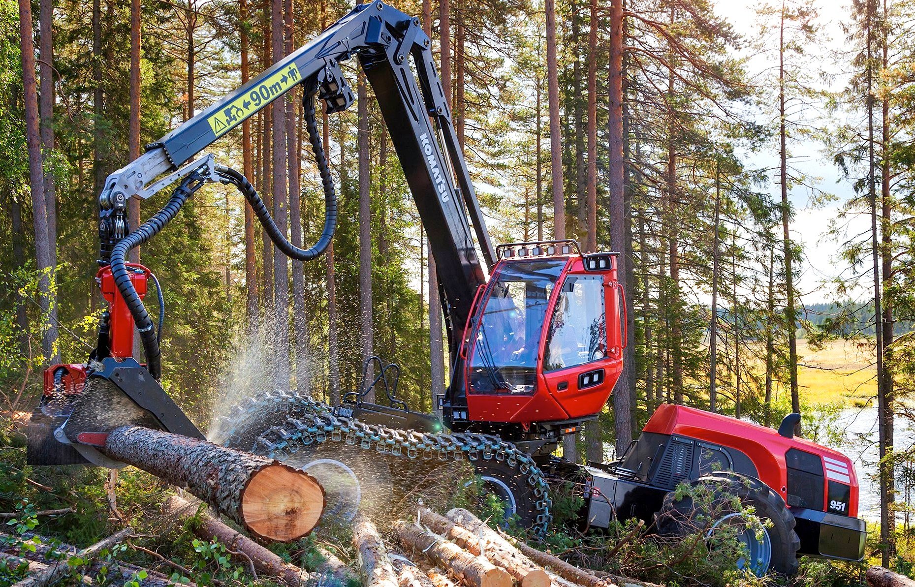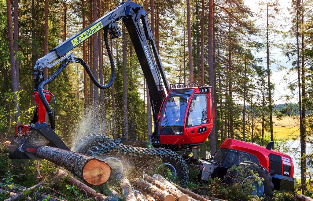 In its distinctive red livery, the Komatsu Forest machinery range includes harvesters (used for the felling and preparation of timber for processing) and forwarders (used to transfer the cut timber within the forest for onward transportation to a sawmill).