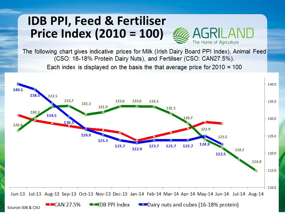 Similar to the IDB Index, we have calculated average feed and fertiliser prices, using 2010 as a baseline of 100. In other words, if the Fertiliser Index is showing a value of 1.14, this means that the current fertiliser price in a given month is 114% of the 2010 average price.