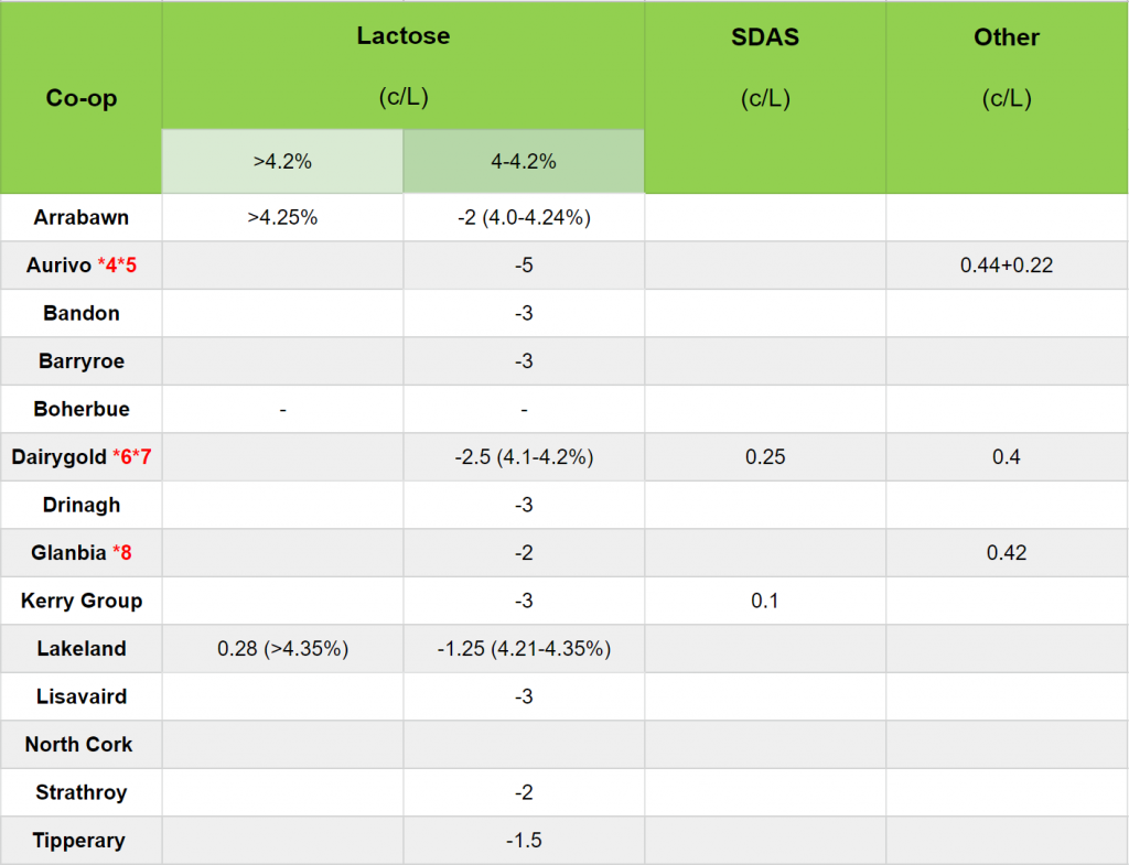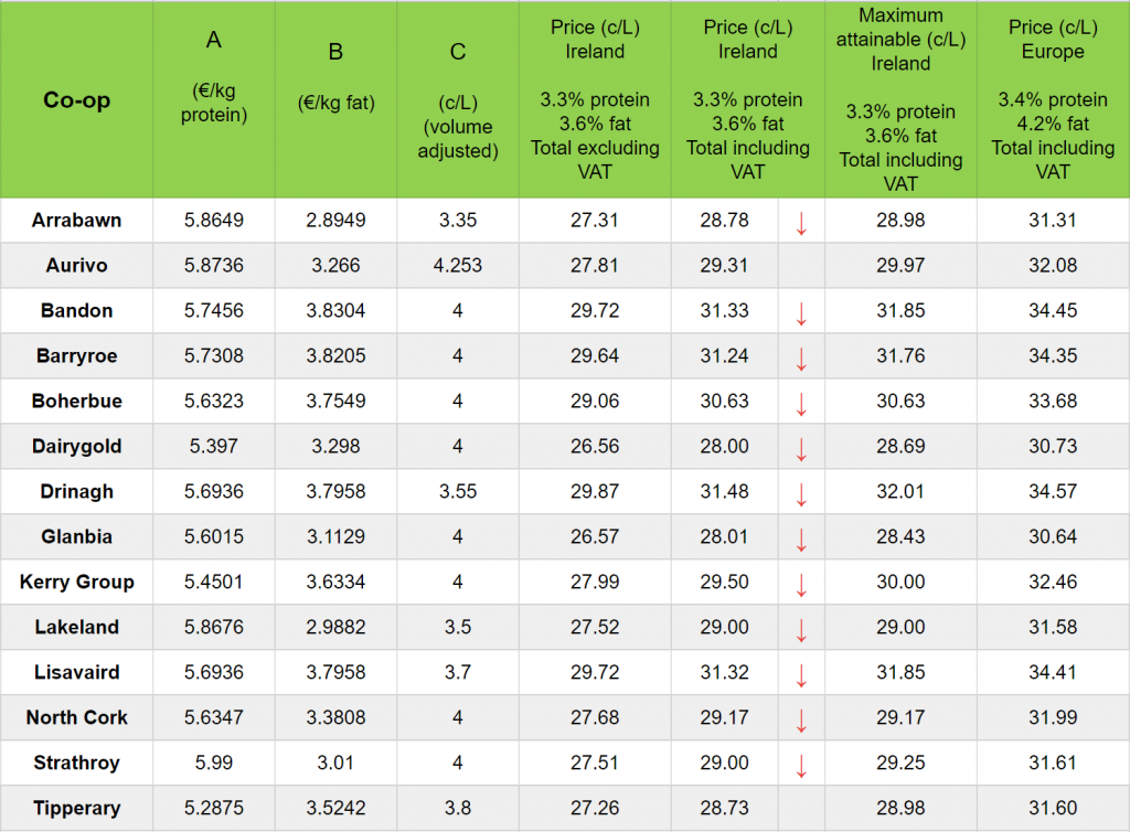 For each co-op, a green arrow indicates an increase in milk price (compared with the previous month); a blank space signifies no change; and a red arrow indicates a drop in milk price.