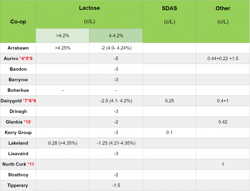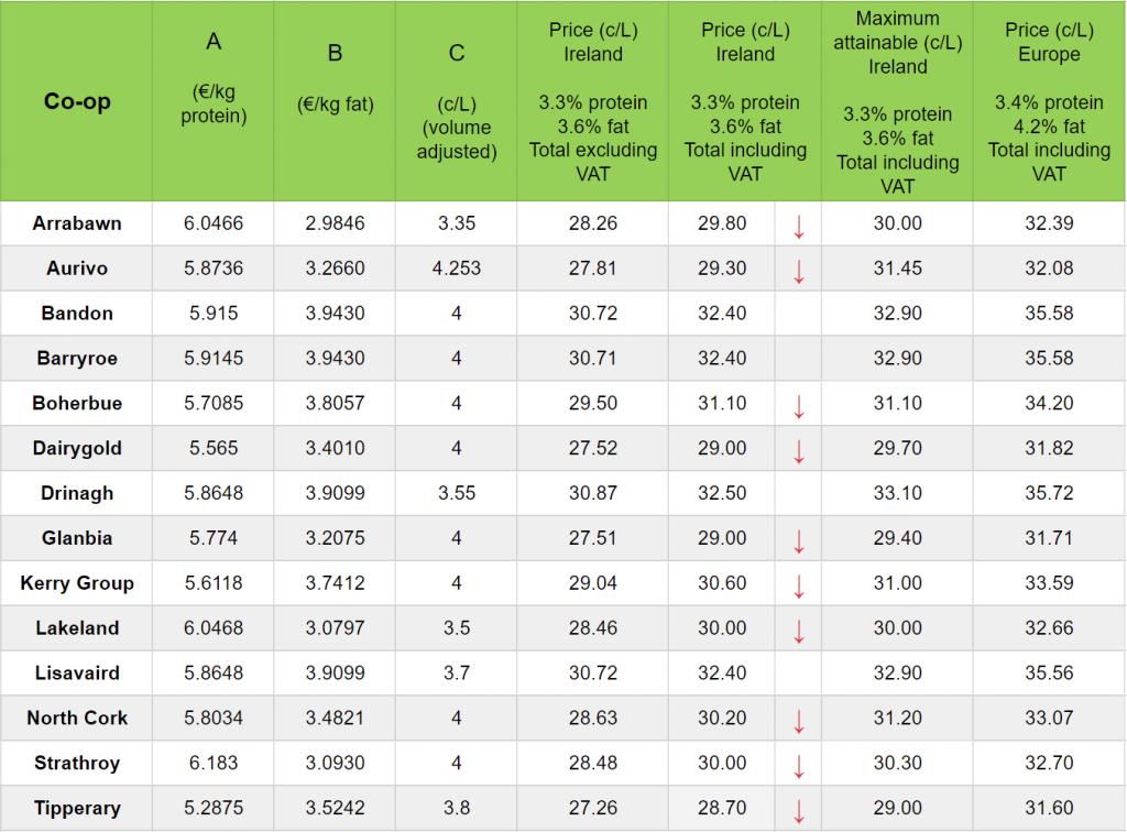 For each co-op, a green arrow indicates an increase in milk price (compared with the previous month); a blank space signifies no change; and a red arrow indicates a drop in milk price.