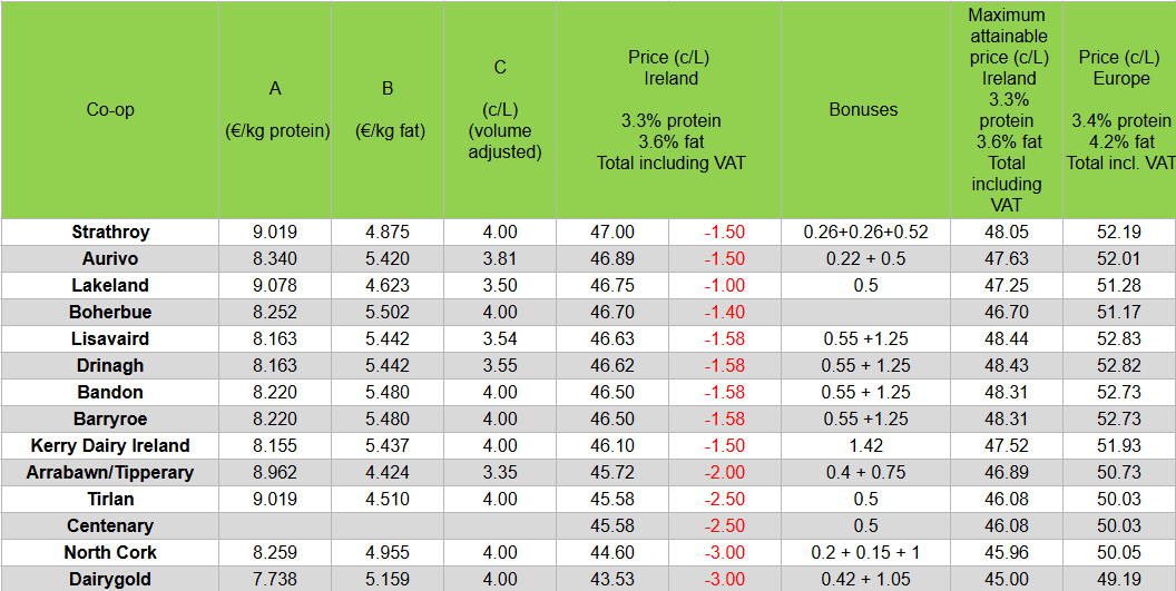 The biggest drop in milk price saw North Cork and Dairygold both drop their base milk price by 3.00c/L which now sees Dairygold at the bottom of the table with a base price of 43.53c/L and North Cork sit second from the bottom with a base price of 44.60c/L.