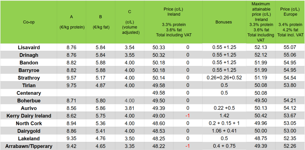 Arrabawn/Tipperary pays a 0.712/L (excl. VAT) sustainability bonus;