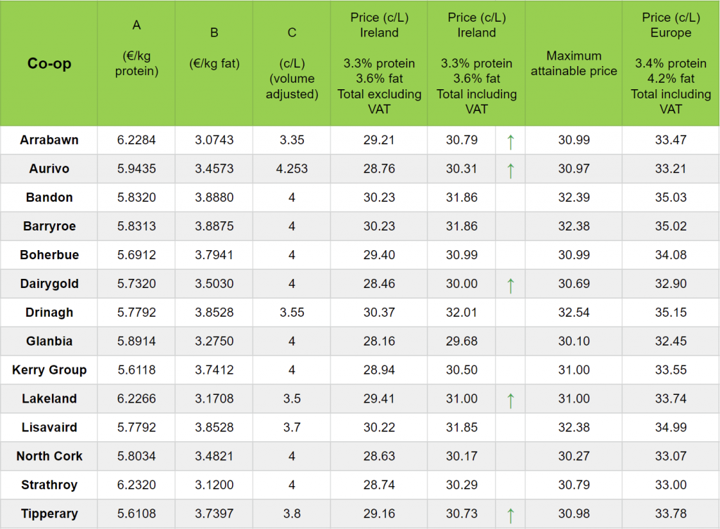 For each co-op, a green arrow indicates an increase in milk price (compared with the previous month); a blank space signifies no change; and a red arrow indicates a drop in milk price.
