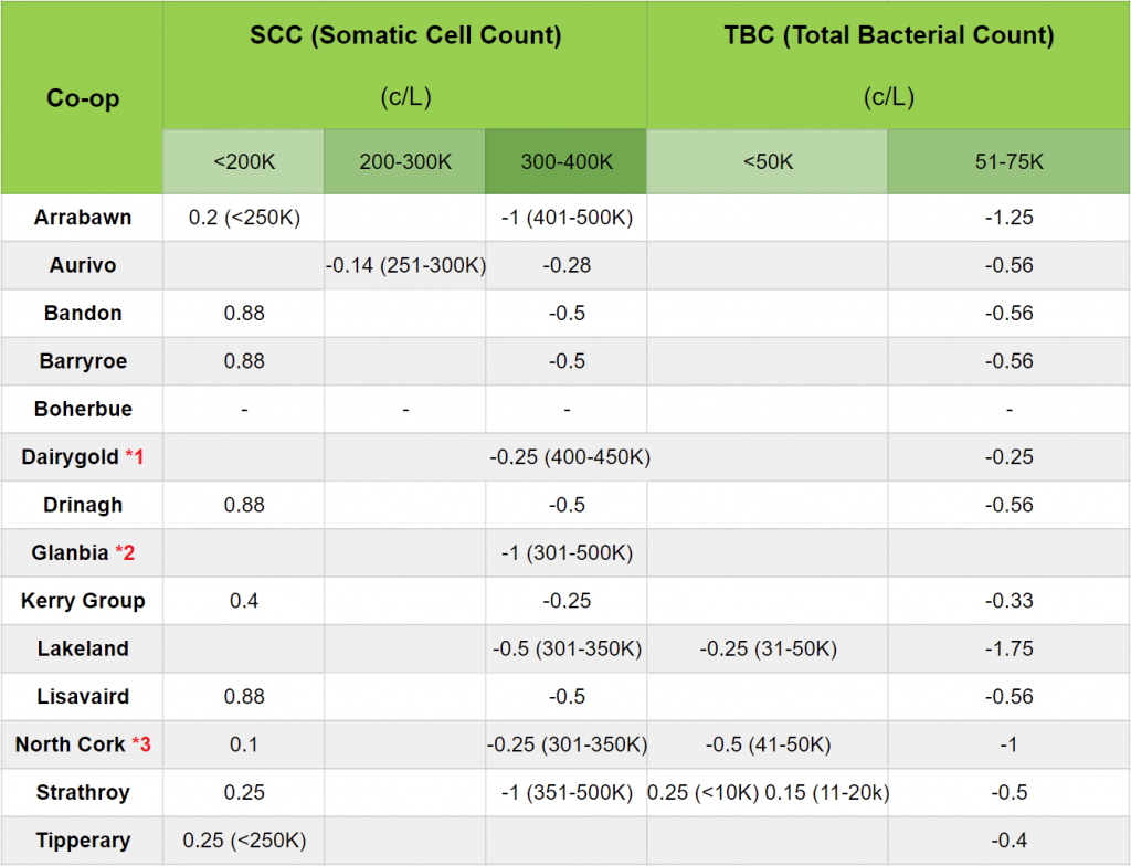 Moreover, the Irish c/L milk prices – quoted in the table – are base prices at the ‘standard’ fat and protein percentages cited by the vast majority of co-ops (i.e. 3.3% protein and 3.6% fat).
