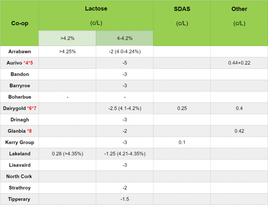 The milk prices in this table (below) are those quoted by co-ops for the month of July (2020).