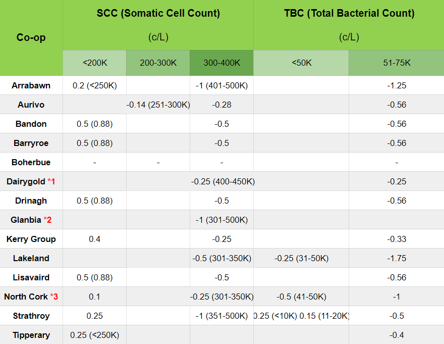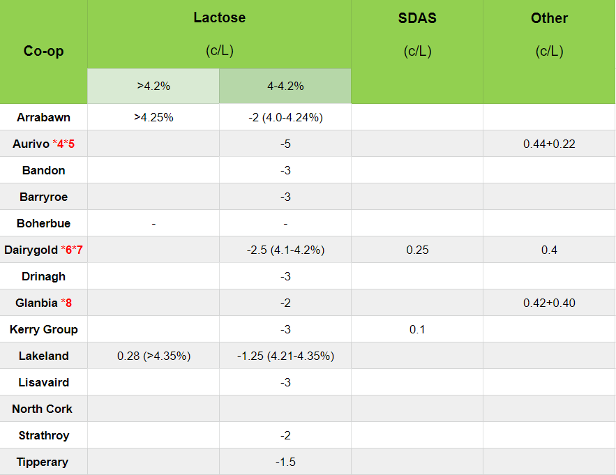 The milk prices in this table (below) are those quoted by co-ops for the month of October (2020).