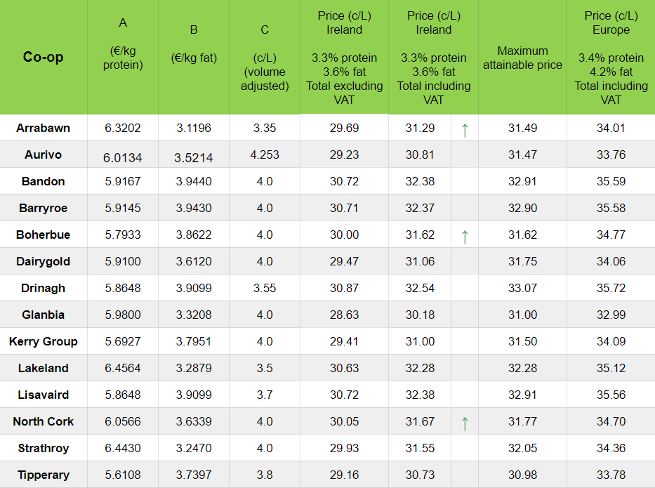 For each co-op, a green arrow indicates an increase in milk price (compared with the previous month); a blank space signifies no change; and a red arrow indicates a drop in milk price.