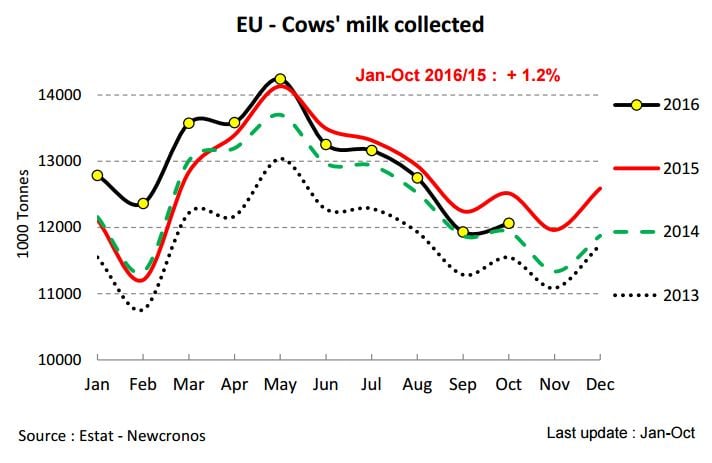 The latest statistics from the EU Milk Market Observatory show that the volume of milk collected across the EU decreased by 3.6% in October 2016 compared to October 2015.