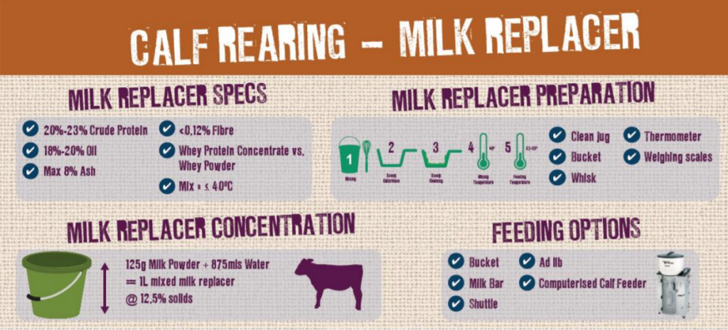 “When you’re looking at milk replacer, you want to check the protein level. So, for beef farmers, we’d be recommending between 20% and 23% protein and 18-20% oil.