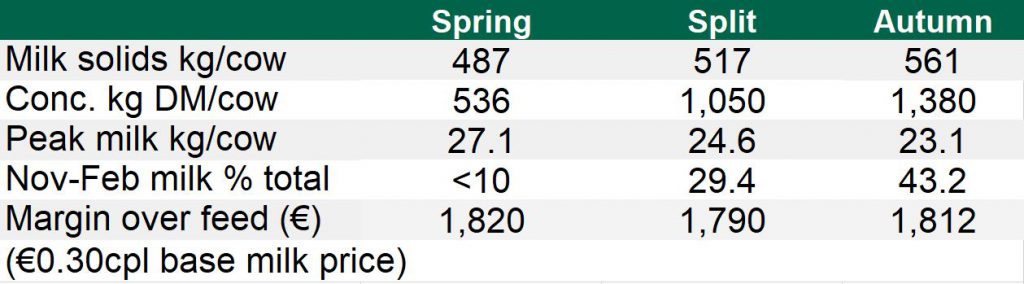So, by calving some of your cows in the autumn your daily average dropped by just 2.5kg/cow – at peak. This shows, given that 50% of the herd calves in the autumn, the difference at peak is relatively small.