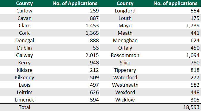 In answer to a parliamentary question by Fianna Fail TD Charlie McConalogue – his party’s spokesperson on agriculture, food and the marine – the minister provided a table that shows the amount of applications per county.