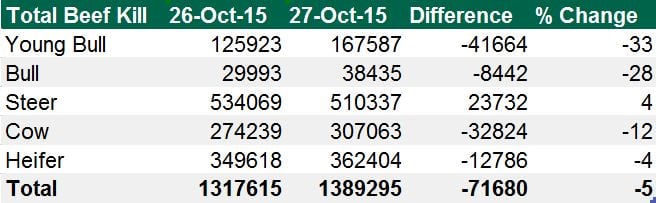 As of October 26, 2015, the cumulative national beef kill was back by 71,680 head on the corresponding period in 2014, figures from the Department of Agriculture show.
