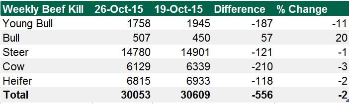Last week’s national beef kill currently sits at 30,053, figures from the Department of Agriculture show, this is a reduction of 556 head from the week commencing October 19 2015.