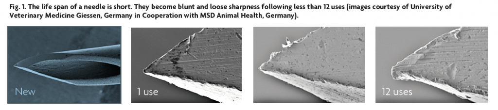 Even if needles are changed between litters, there is a very speedy deterioration of the needle tip after its first use.