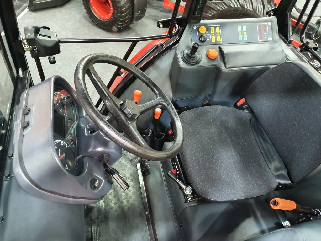 The tractor – a Belarus 742.7 to use its precise model designation – on display at Agritechnica 2019 was fitted with a four-cylinder, 75hp Caterpillar (CAT) engine. That’s mated to a 12F 12R synchromesh transmission (other transmissions are optional).