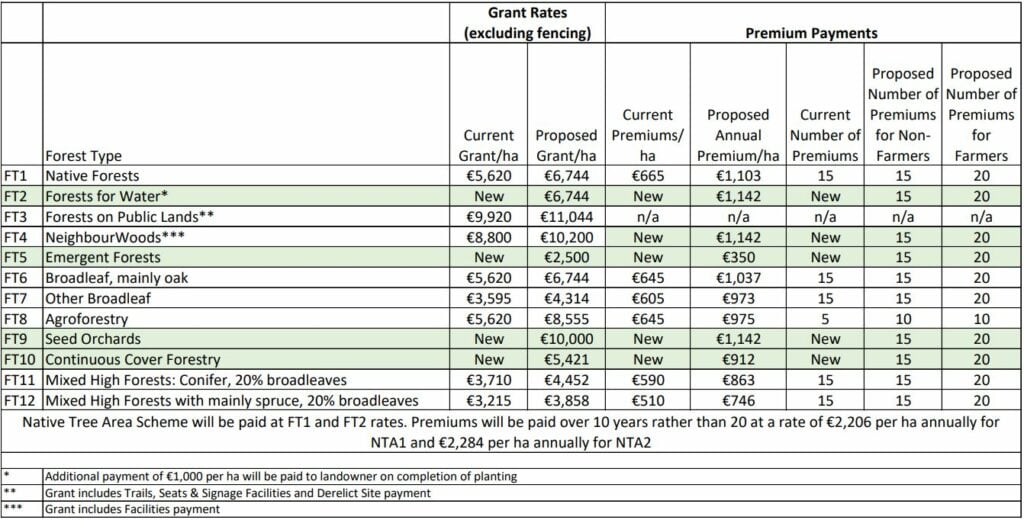 The rates have increased for all 12 categories of forests, with the grant payment for native forests increasing to €6,744/ha, the broadleaf payment increasing to €4,314/ha and the agroforestry payment increasing to €8,555/ha.