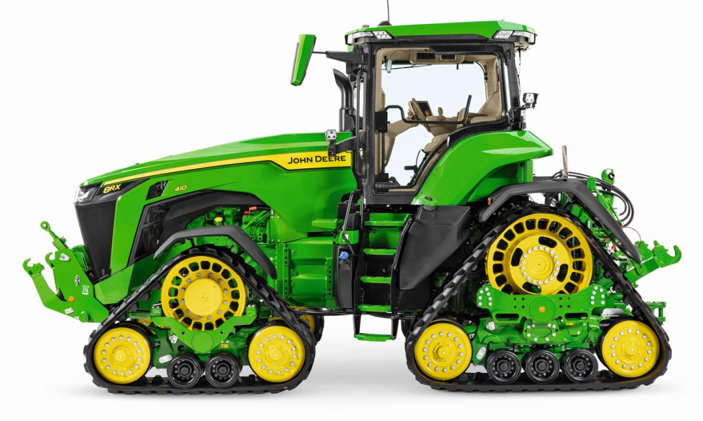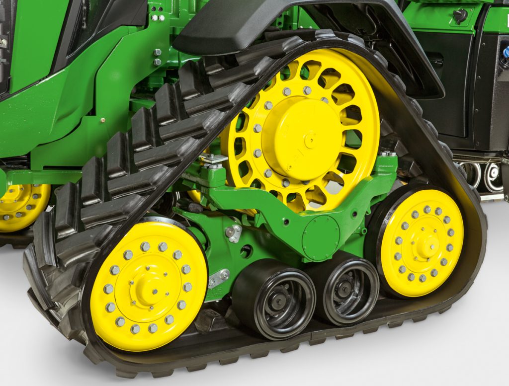 Compared to two-track designs, the 8RX is claimed to be “significantly more stable on hillsides”. John Deere says that it also “performs well in more challenging soil conditions, due to its superior self-cleaning ability”.