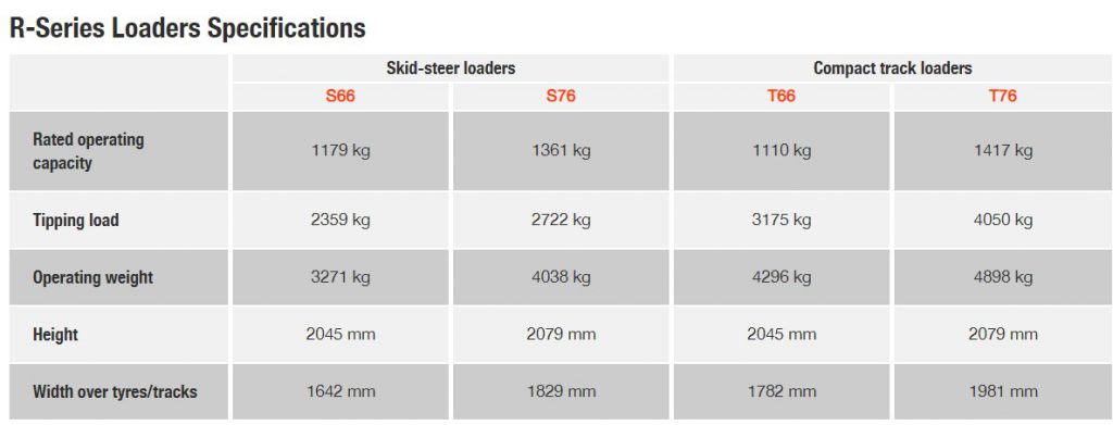 Tipping loads range from 2,359kg to 2,722kg for the skid-steers, and 3,175kg to 4,050kg for the track loaders.