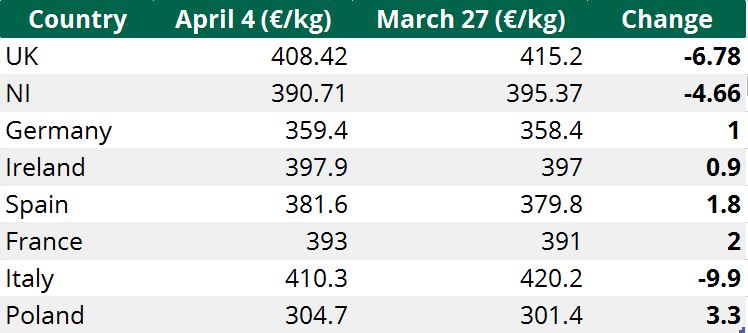 During the week ending April 4, German beef prices increased by 1c/kg to 359.4c/kg, Spanish beef prices jumped by almost 2c/kg, while Italian R3 heifer prices dropped by 10c/kg compared to the week previous.
