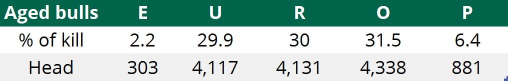 Moving on to aged bulls, or those over 24-months-of-age at slaughter, department figures show that 2.2% (303 head) of these animals graded E, 29.9% (4,117 head) were U grade and 30% (4,131 head) were classified as R grades on the grid.