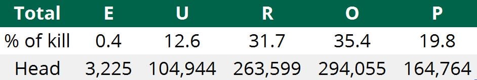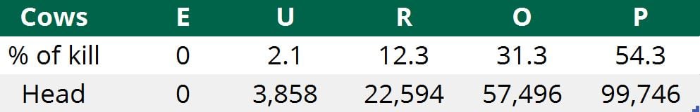 And unlike the total kill, which was dominated by O and P-grade stock, the majority of young bulls graded U (41%) or R (28.5%) at the time of slaughter.