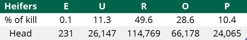 For the most part the heifer kill, which consisted of 231,390 head, was dominated by heifers producing R and O-grade carcasses.