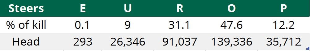 Focusing on steers first, the majority of these were classified as being either O (31.5%) or P (12.2%) on the grid.
