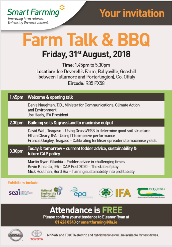 A free farm talk and BBQ is being hosted by Smart Farming participant Joe Deverell and his family in Geashill, Co. Offaly, on Friday, August 31, at 1:45pm.