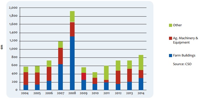 Investment in agricultural machinery and equipment has been a major driver of growth and has increased by 149% over the last five years. Investment in farm buildings has grown steadily over the last three years and rose by 15.5% in 2014 to €222.6m.