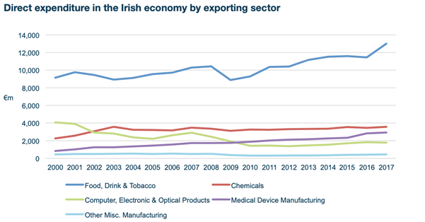 Indeed, as the chart shows, ‘Irish economy’ expenditure by the food and drink industry runs at five times that of the next biggest ‘Irish economy’ spender – the pharmaceutical sector.