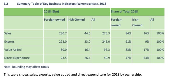The first table shows that sales and exports for the multinational sector are in excess of €220 billion. By contrast, ‘Irish economy’ expenditure was just €23 billion.