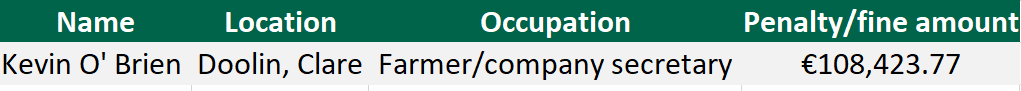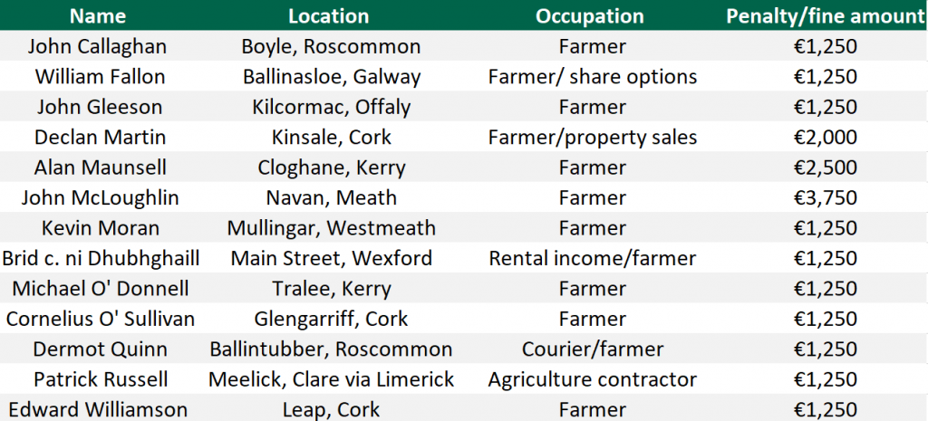 The list was published yesterday, Tuesday, June 11, and shows that, of these 22 farmers, 13 were penalised for failing to lodge tax returns, eight were fined for the misuse of marked mineral oil, while one substantial fine of €108,423.77 was handed out in Co. Clare relating to the under-or-non-declaration of tax.