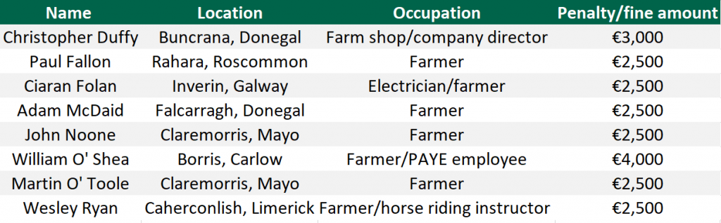 When the the larger fine handed out in Co. Clare is discounted, the combined penalty handed out to the remaining 21 farmers stood at €42,750.