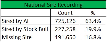 The statistics based on 1.14m dairy cows in 16,462 herds with more that 10 cows, show that a total of 725,126 dairy cows were sired by AI bulls, while a further 227,258 dairy cows (19.9%) were born after stock bulls.