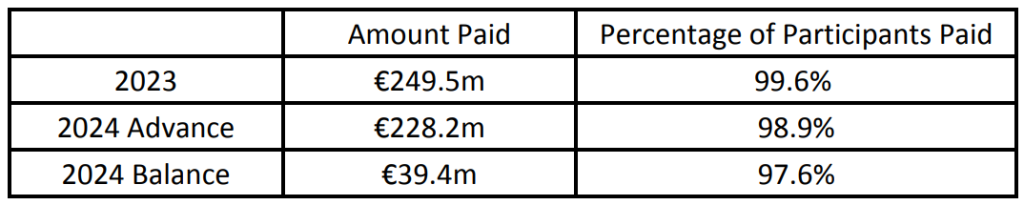 Almost €267.7 million is in respect of participation in the scheme in 2024, while over €249.5 million relates to participation in 2023, the Department of Agriculture, Food and the Marine (DAFM) said in an update.