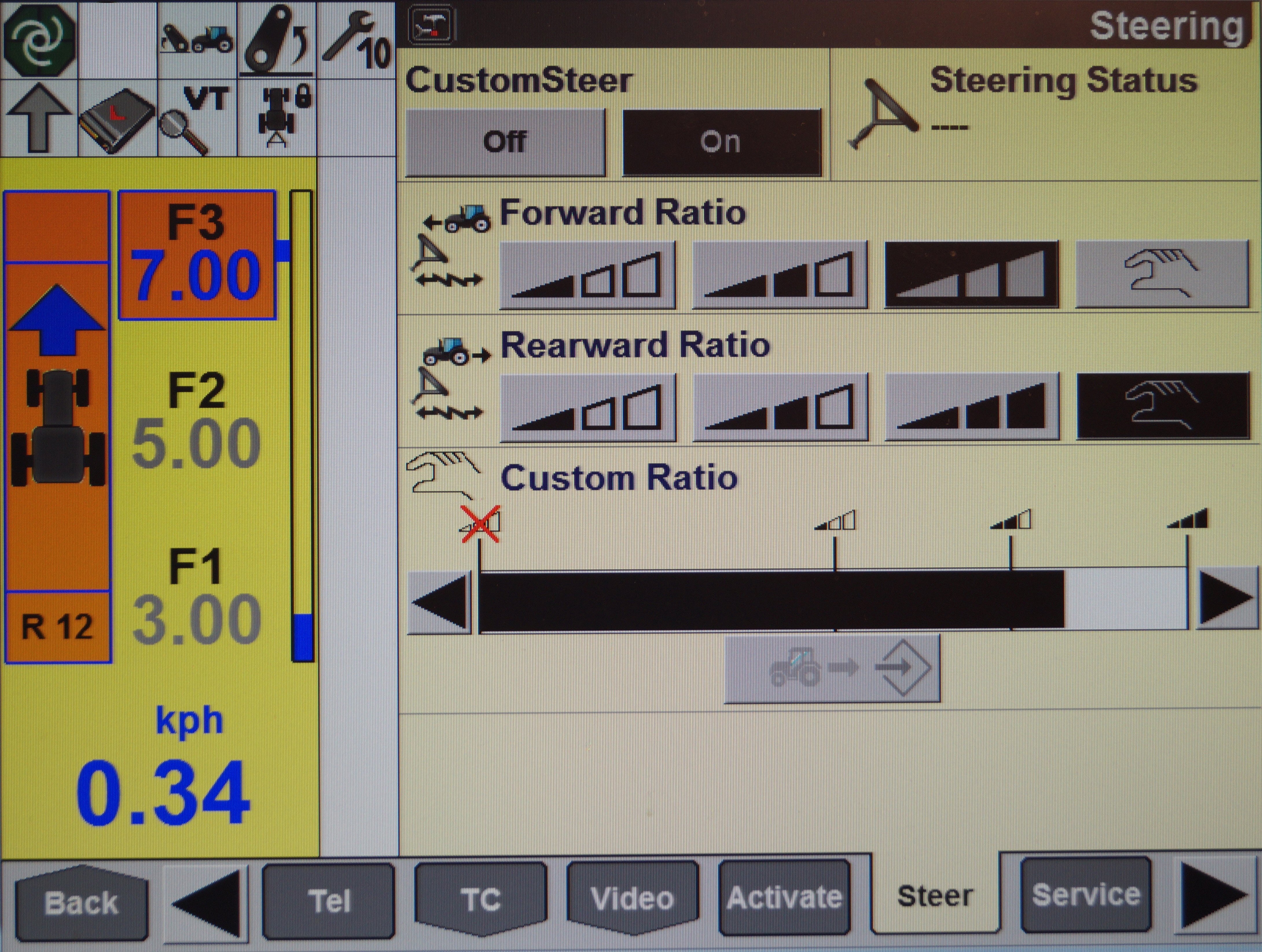 For safety at high speeds, any chosen custom ratio is gradually dialled out as speed increases – up to 26kph. Slow the tractor down and CustomSteer will automatically re-engage.