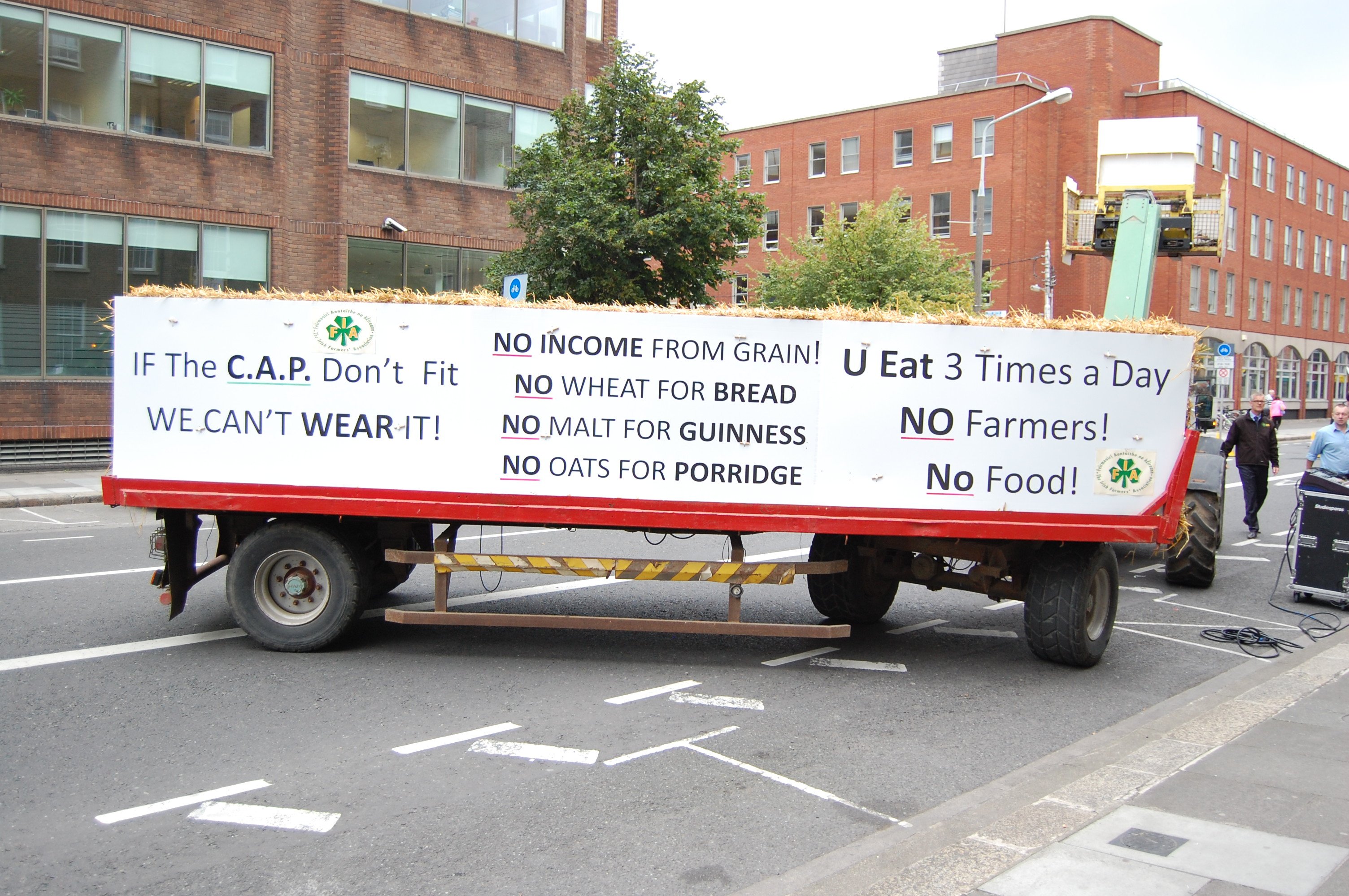 Grain farmers had their say with a trailer with a slogan on it saying “if the CAP don’t fit we can’t wear it”.