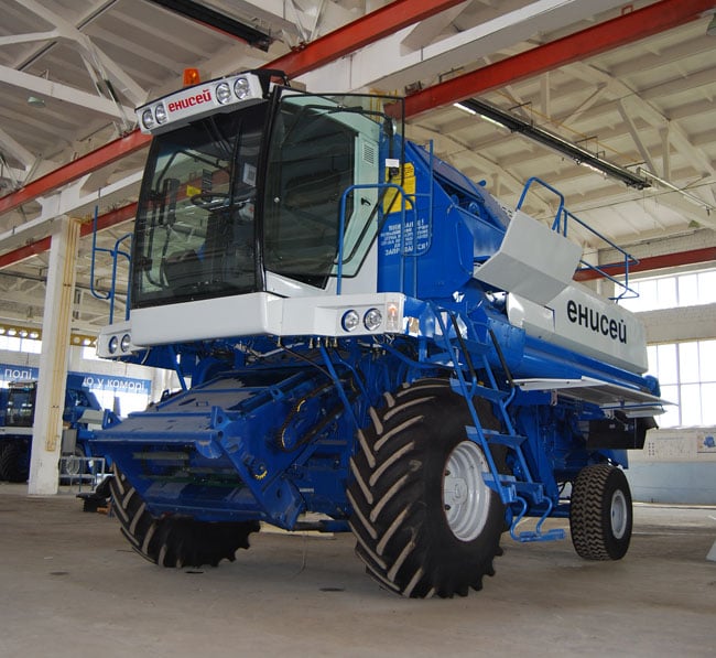 Like the forager, previous incarnations of its combines were also noteworthy for their similarly-distinctive, “swept-back” cabs. Below is an Enisei-badged machine.