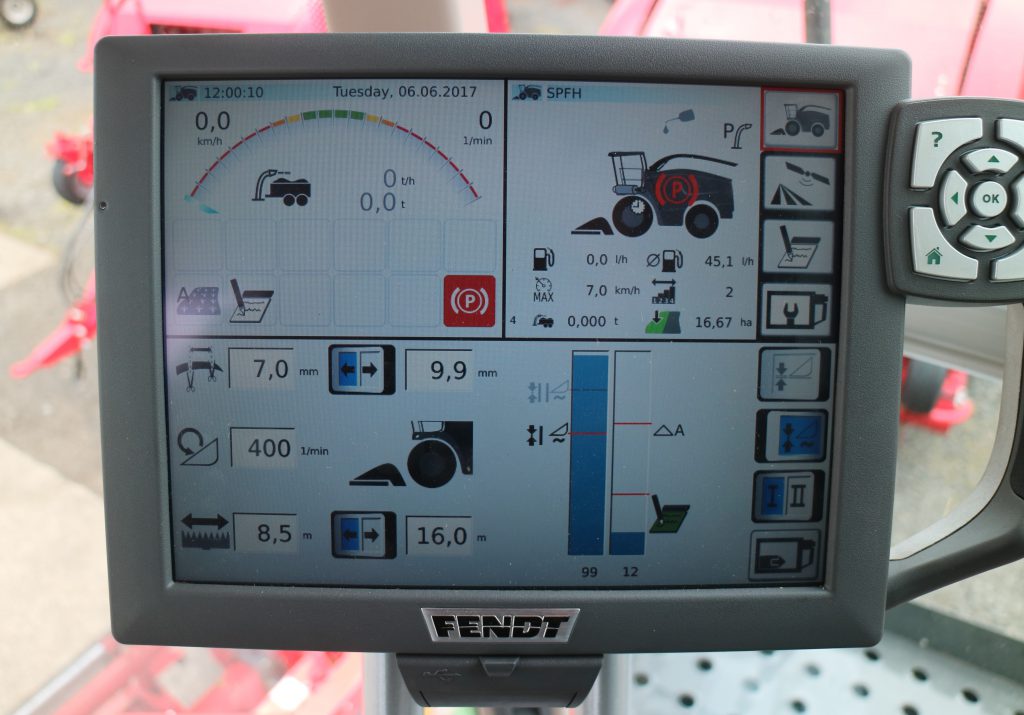 Up top, the operator sits aloft in relative comfort – courtesy of Fendt’s X5 cab. It has an abundance of curved glass – and appears wide but not very deep, compared to cabs on some other foragers.