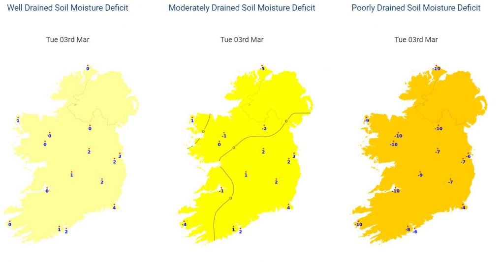 The image below shows soil moisture deficit levels for Tuesday, March 3. The driest level recorded was at Johnstown Castle, Co. Wexford, with a reading of 4.